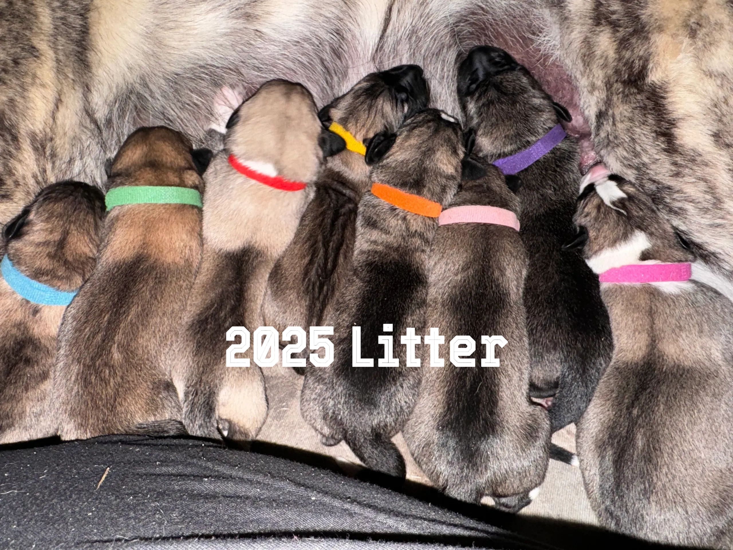 In 2025, we bred Rousey with Ranger. On May 9th, 2025, 9 Puppies made their debut. They were the best! Each puppy had their own special coloring. There were brown dominant and black dominant brindles. There were really light colored fawn and tan fawn, and even one Dutch-marked Fawn. Each puppy's personalities were different from the next. The 2025 litter has all moved on to their forever homes. I get updates often. I love seeing them thrive in their new lives and grow into exceptional guardians like their ancestors.